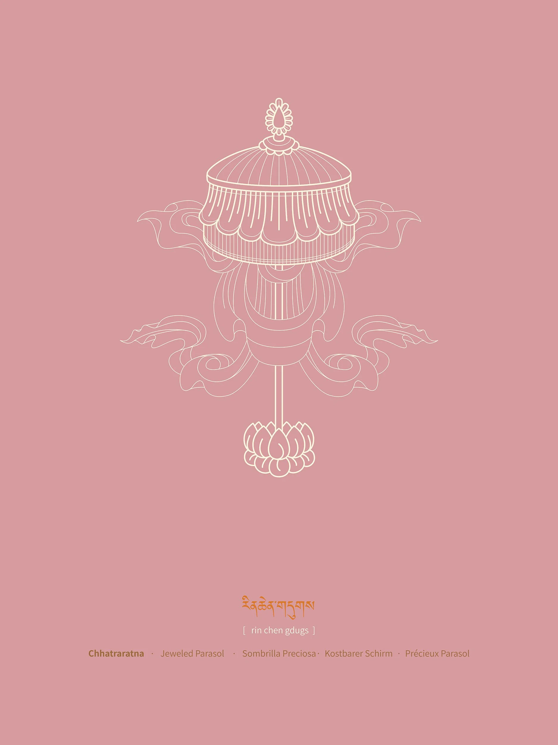 The Buddhist parasol origins as a symbolic depiction of a sacred medicinal and hallucinogenic mushroom of the Himalayan region; representing the protection from any kind of harmful forces, especially from illness and spiritual temptations. On a more abstract level it represents the firmament of the sky and therefore the expansiveness and unfolding of space. The jeweled parasol provides safety and shelter in the Dharma.
