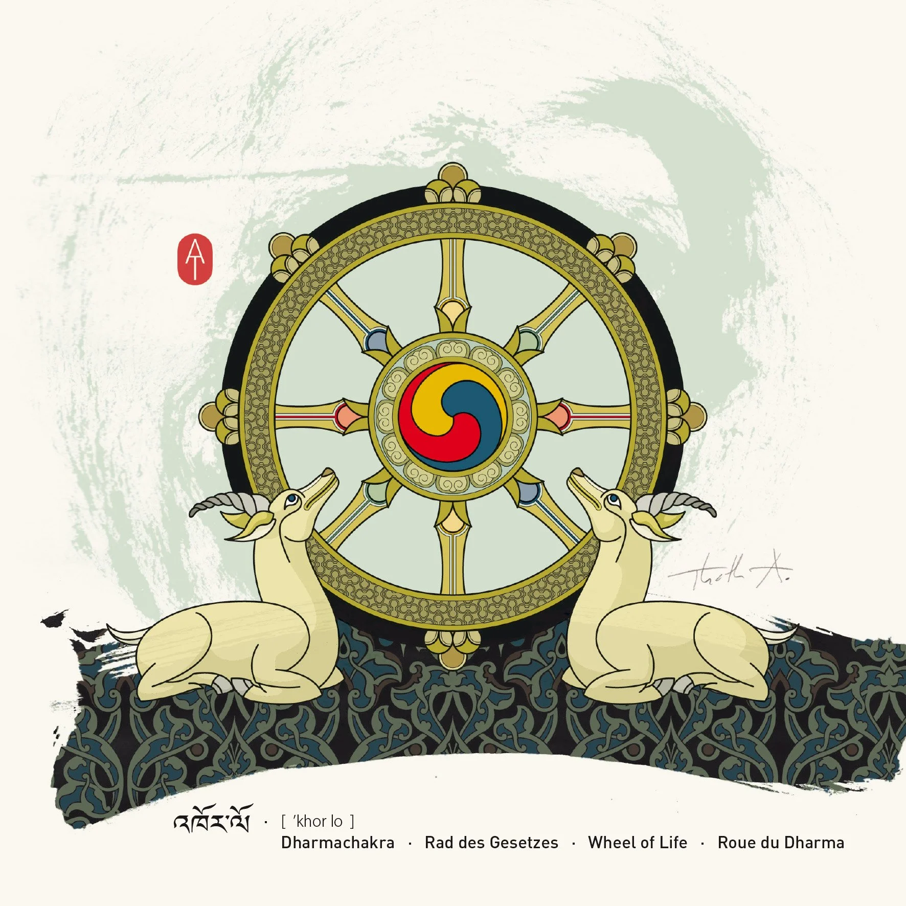 The Dharmachakra (wheel of life / wheel of law) symbolizes Buddha’s teaching and is one of the eight auspicious, Buddhist symbols (Ashtamangala). In the Himalayan region, the wheel of life is traditionally accompanied by two deers (Indian gazelles). This form of presentation is intended to remind the viewer on Buddha’s first sermon in the deer park of Sarnath.
