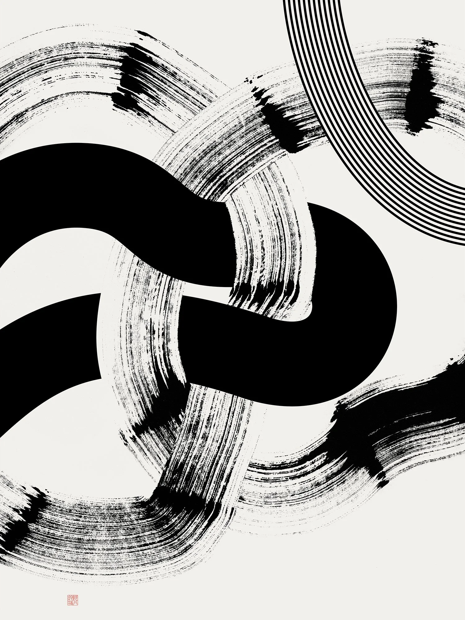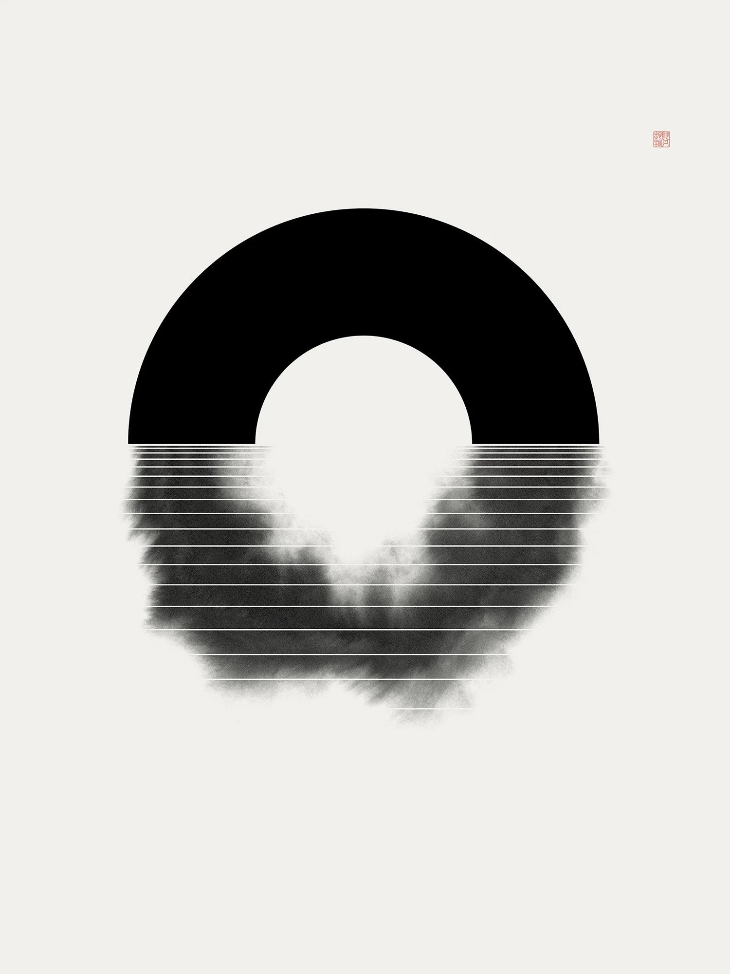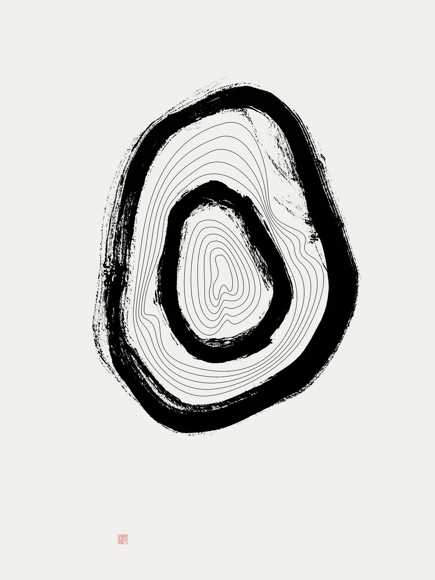 The Rings of Suminagashi : The title of this piece might sound like a fantasy novel, but Suminagashi is actually a traditional Japanese marbling technique, where sumi ink floats on water in concentric rings. The process is similar to the Western art of paper marbling, known as ‘ebru.’ Inspired by the distinctive Suminagashi patterns, Thoth created this piece using brushed sumi ink and vector drawings.