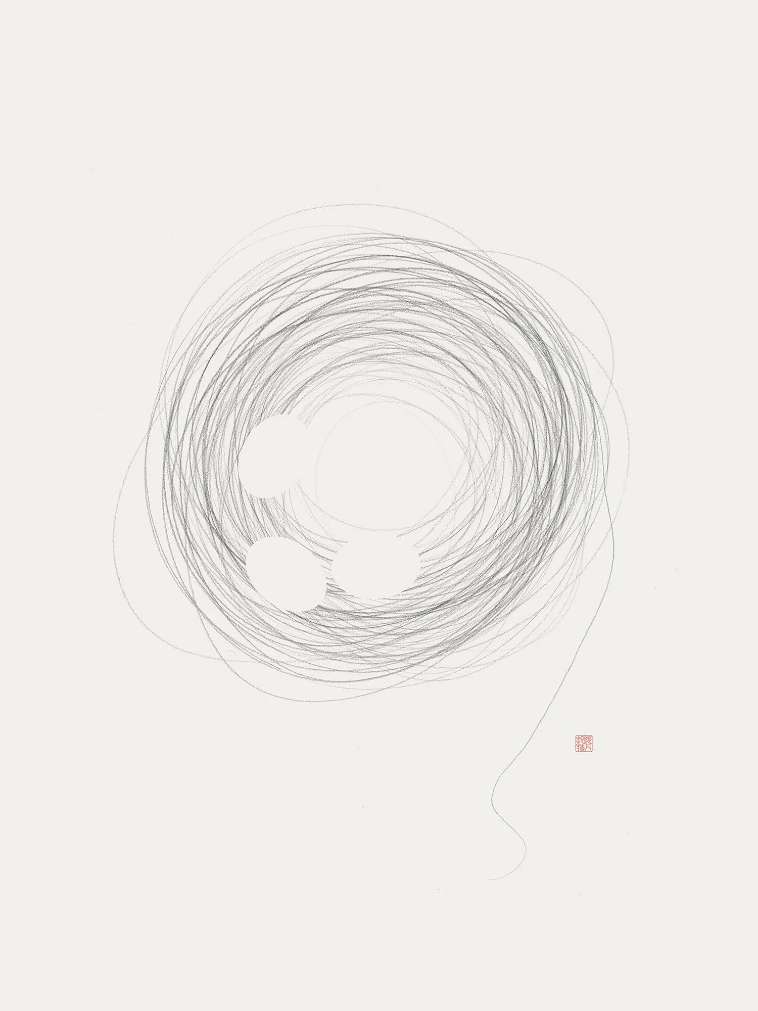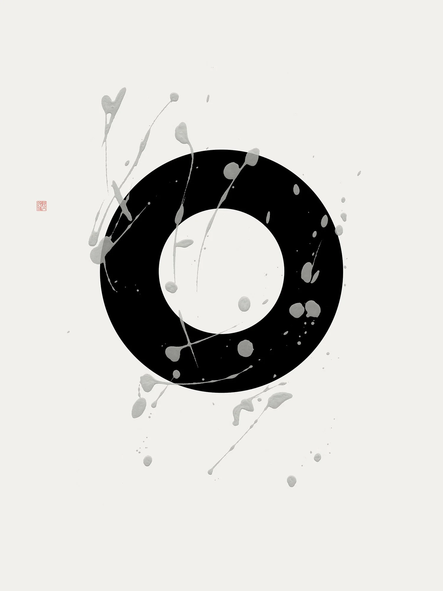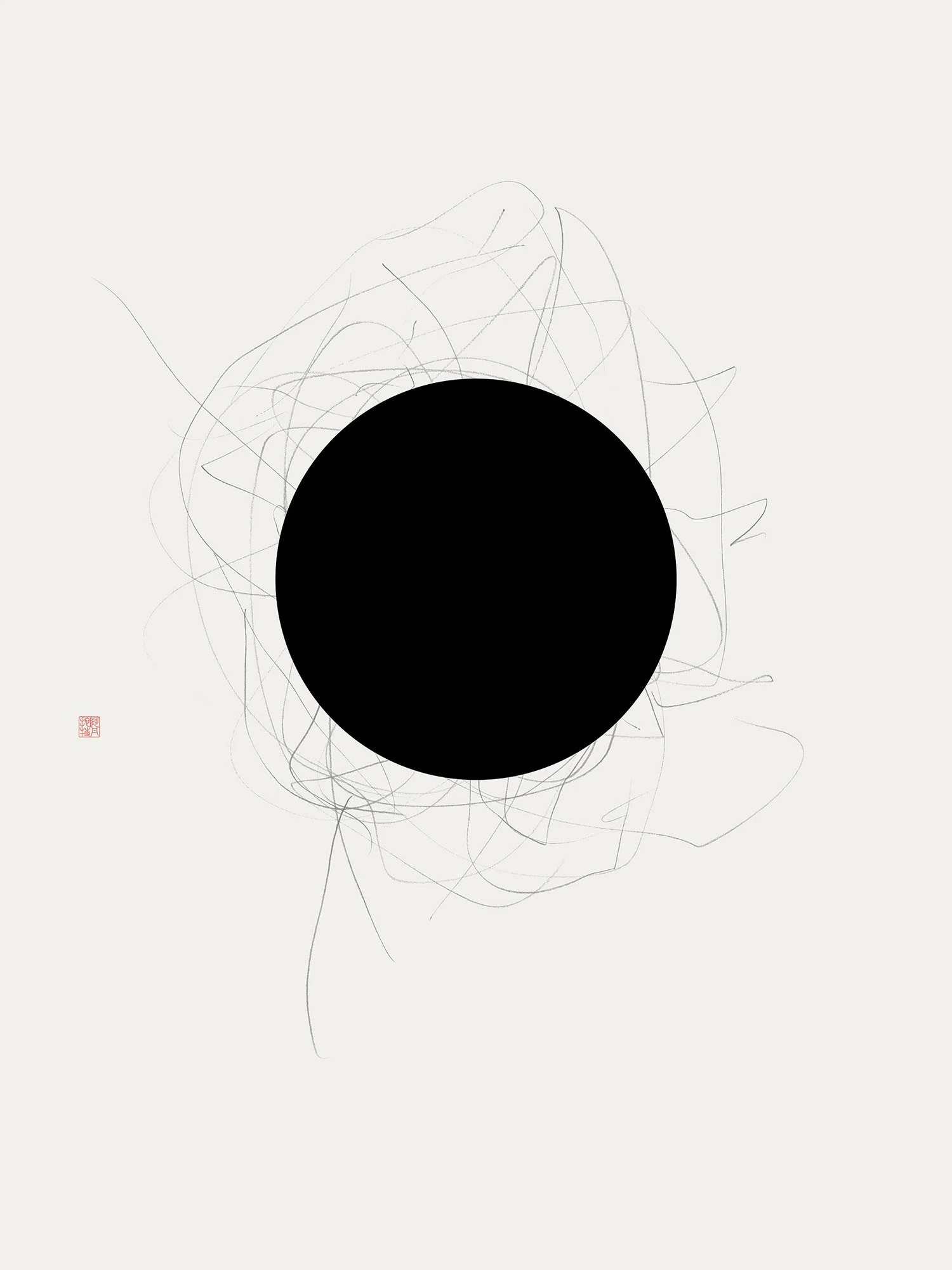 The Rings of Suminagashi : The title of this piece might sound like a fantasy novel, but Suminagashi is actually a traditional Japanese marbling technique, where sumi ink floats on water in concentric rings. The process is similar to the Western art of paper marbling, known as ‘ebru.’ Inspired by the distinctive Suminagashi patterns, Thoth created this piece using brushed sumi ink and vector drawings.
