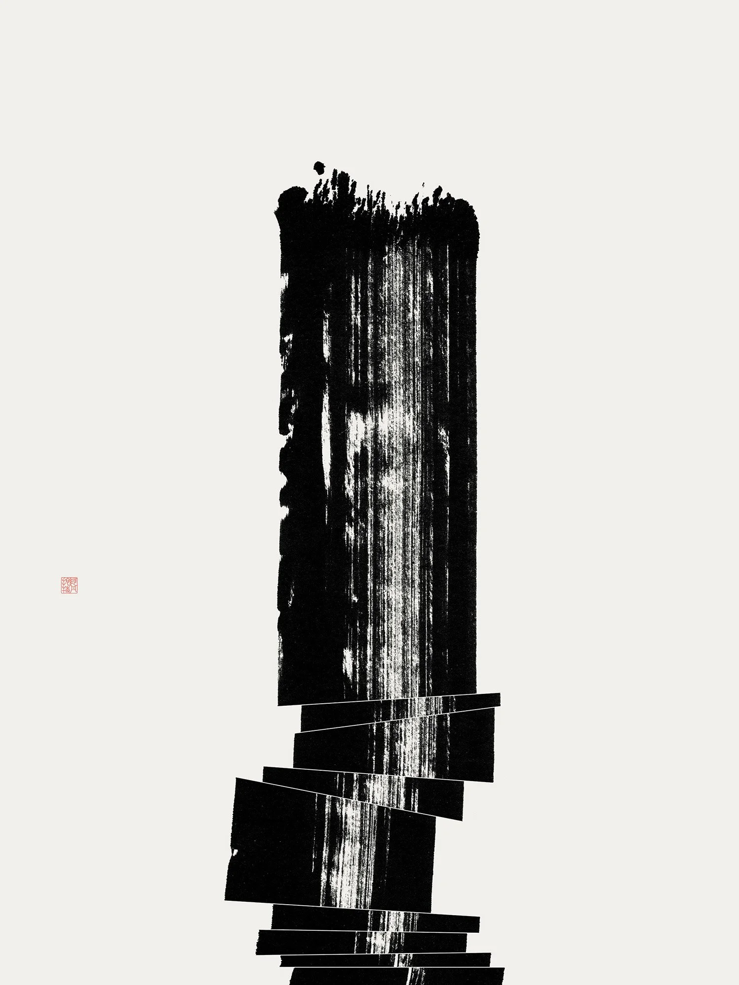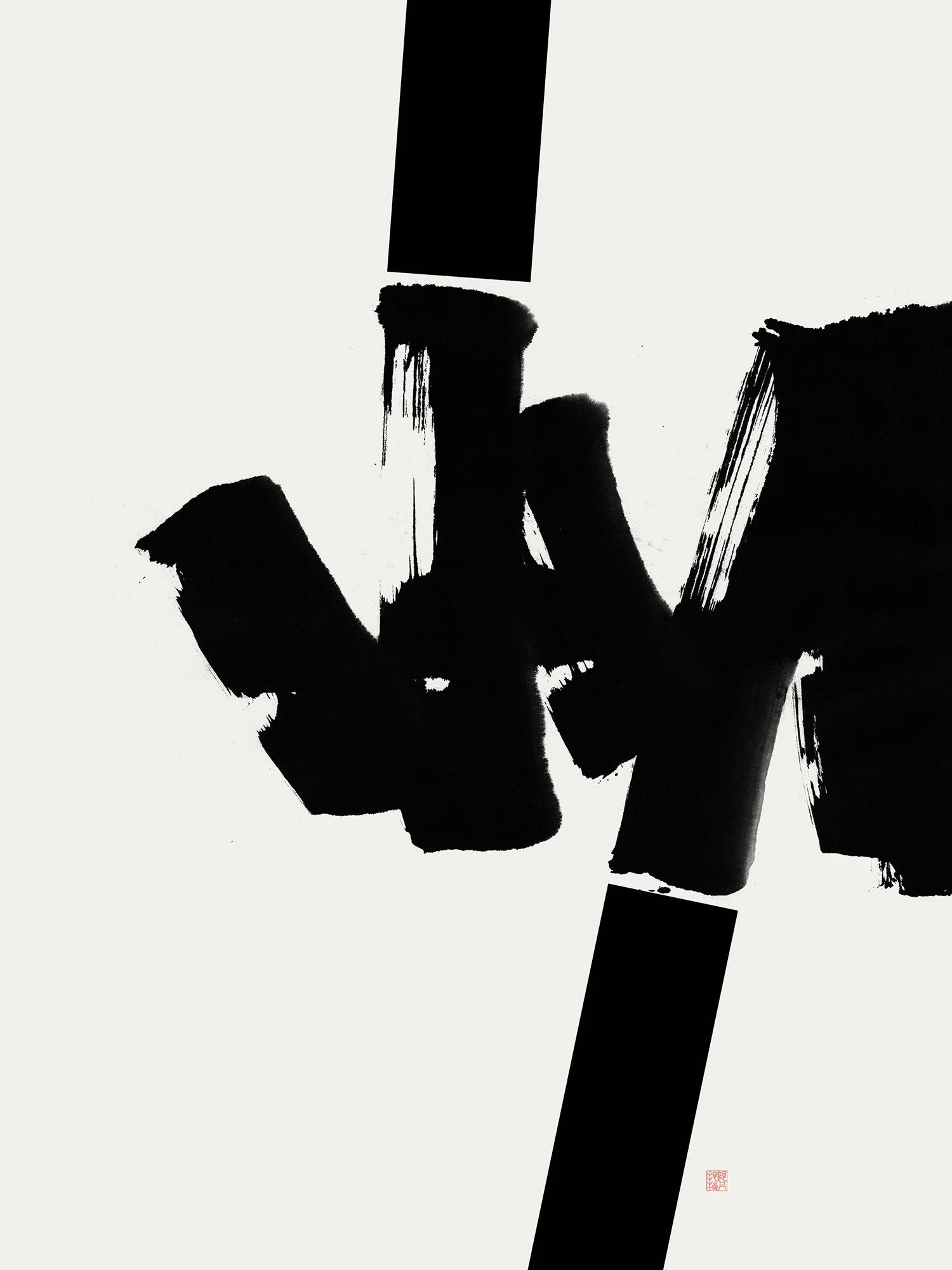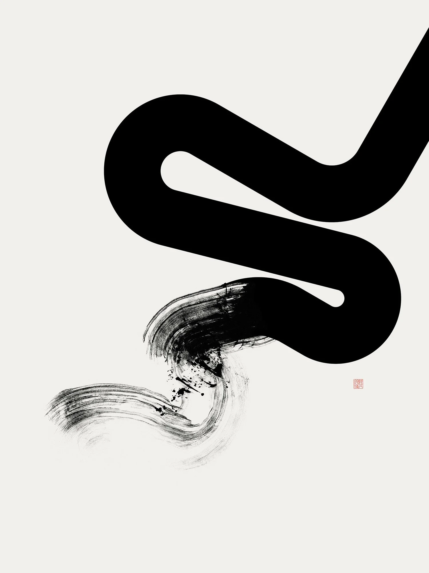The 32 pieces in this collection oscillate between the two worlds, sometimes blending them, at other times highlighting their contrasts. Thoth restricts the palette to black and white, combining the fluidity of brushed Indian ink with the precision of computer-generated vector drawings. This disciplined approach mirrors the minimalist ethos of both traditions, emphasizing clarity, simplicity, and the power of negative space.